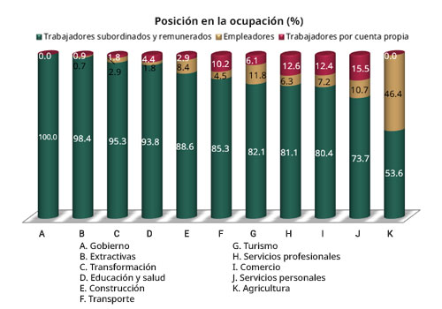 En promedio, 9 de cada 10 ocupados en el país son trabajadores subordinados y remunerados. El sector Gobierno es donde todos los ocupados son trabajadores que reciben un pago por su trabajo.